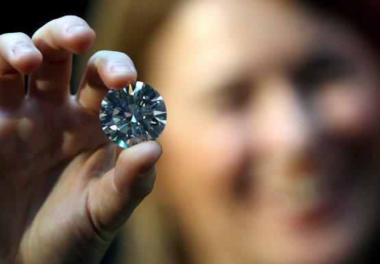 Na foto está um diamante puro perfeito, cujo valor está entre os 10 a 14 milhões de euros. Este diamante é o maior diamante branco sem falhas alguma vez leiloado.